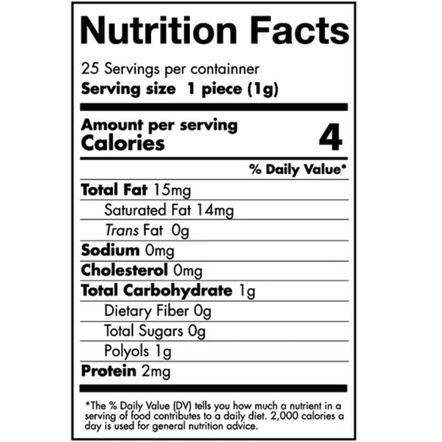 Porzione/Caramella (1 g). Energia per 100 g: 1680 kJ/400 kcal; grassi 1,5 g di cui saturi 1,4 g; carboidrati 97,2 g di cui zuccheri 0 g; polioli 97,2 g; fibre 0,9 g; proteine 0,2 g.